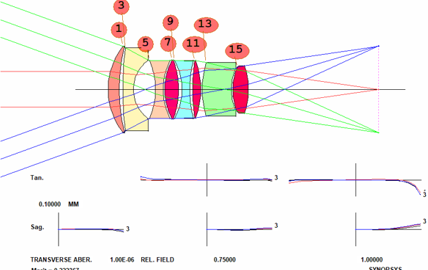 镜头组合都经历一遍,最后给出评价函数最小的10个最有潜力的结构。做变焦结构时,需要 ZSEARCH 输入中指定前固定组、变焦组、补偿组、后固定组。而且由于 SYNOPSYS 使用的是伪二阶导数算法,它的速度特别快,从7个平行平板设计到像质OK的7片式