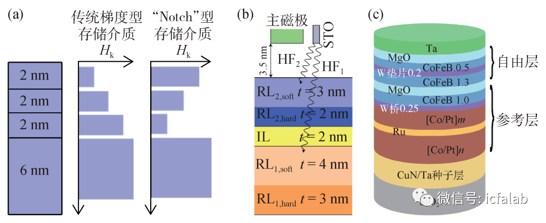 图8 (a)分层式存储介质[15];(b)3D微波辅助磁记录的实现原理,其中HF是高频微波磁场,STO是自旋纳米振荡器,RL是存储层,IL是间隔层[16];(c)基于CoFeB/MgO具有复合自由层的磁性隧道结结构[17] S~.%G)R