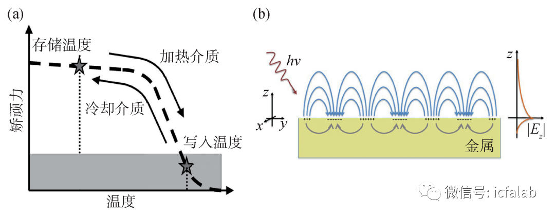 <h9o>h 为了进一步提升微波辅助磁记录系统的存储密度,2019年Chan等人提出了3D-MAMR的构想[16]。如图8(b)所示,存储单元上下堆叠且具有不同大小的垂直磁各向异性。由于微波磁场的频率需要和存储介质的本征铁磁共振(ferromagnetic resonance,FMR)频率相匹配才能诱导磁矩发生共振,减小临界翻转磁场。因此,改变微波磁场的频率可以对存储单元实现选择性的翻转。自旋纳米振荡器产生微波磁场的频率可以通过调节注入电流的大小改变。 #80r?,q 除了存储介质的结构设计,优化自旋纳米振荡器的微波性质同样非常重要。如前所述,为了保证存储介质的热稳定性,随着存储密度的提高,厂商不得不采用具有更高垂直磁各向异性的材料。在微波辅助磁记录技术中,这意味着自旋纳米振荡器必须输出更高频率的微波信号。根据Kittel公式[13],自旋纳米振荡器微波信号的频率也即自由层磁矩进动的频率取决于磁有效场的大小,因此增加外磁场的强度是提升微波磁场频率最直接的方法[5]。然而受到体积的限制,磁头可以施加的磁场被局限在一定的范围内。2018年,北京航空航天大学王梦醒等人提出一种具有复合自由层的垂直磁隧道结结构[17]。如图8(c)所示,磁性自由层中插有一原子层厚度的W,双W/CoFeB以及双CoFeB/MgO界面为器件带来了非常强的界面垂直磁各向异性。这一结构有望用于实现高频率自旋纳米振荡器,进一步提升微波辅助磁记录系统的存储密度。 !F#^Peb *Q,9 [k s"0Hz"[^= e1 P(-V 4 热辅助磁记录 u!I=|1s 4Kn)5> .\|}5J9W 4.1 热辅助磁翻转效应的理论研究热辅助磁记录是另外一种能量辅助磁记录模式。不同于微波辅助磁记录技术,这里的能量来源于激光。事实上利用激光完成或辅助磁场存储信息并不是一个新鲜的事物。20世纪70年代,荷兰飞利浦(Philips)公司率先开展将激光用于信息存储的研究,1979年成功推出首个相关产品,也就是我们所熟知的光盘(optical discs)[18]。然而,最初的光盘是由非磁性介质构成的,经激光照射后会形成“凹坑”,光盘表面事实上是凹凸不平的,代表所存储的数字信息。因此,在光盘中信息的写入完全由激光完成。1983年,Immink和Braat展示了一种新型的记录模式,他们在光盘的基片上镀了一层磁性材料,形成所谓的“磁光盘”(magneto-optical discs)[19]。在写入信息时,激光和磁场共同作用,完成信息的写入,这事实上就是热辅助磁记录的雏形。然而,无论是普通光盘或是磁光光盘,都只经历了短暂的辉煌。受到衍射的限制,激光光束最小只能聚集于几百纳米的范围,光盘的容量受到了很大的制约。而与此同时,在巨磁阻效应以及隧道磁阻效应的推动下,硬盘的存储密度在飞速提升,因此光盘逐渐淡出了人们的视野。2012年,希捷公司将沉寂多年的热辅助磁记录推到了聚光灯下[20]。特殊的是,希捷提出将热辅助磁记录技术和硬盘相结合,同时利用表面等离子体共振效应(surface plasmon resonance,SPR)将激光能量汇聚于纳米尺度,有望实现超高密度数据存储。 WizVw&Iv M7\K iQd 图9 (a)热辅助磁记录的基本原理;(b)表面等离子体共振效应[21] Rc`zt7hbJ $WZHkV 如图9(a)所示,在热辅助磁记录过程中,激光脉冲将具有高垂直磁各向异性的存储单元加热至居里温度附近(通常为400—600℃),此时磁矩能量较高,磁矫顽场也即临界磁翻转场非常低,磁矩易于翻转。与此同时,激光未照射区域的存储单元矫顽力仍然比较大,写入磁场不会对其造成影响。之后,存储介质的温度迅速降低,磁矩指向趋于稳定,写入的数据信息就被保存下来[21]。通过这一手段,较小的外加磁场即可翻转具有较高垂直磁各向异性的存储单元,有助于实现更高的存储密度。另一方面,表面等离子体共振效应是指在入射光频率与金属表面自由电子的振动频率相匹配时,自由电子产生相干振荡进而产生表面等离子体的一种现象,如图9(b)所示。利用表面等离子体共振效应,激光能量可以转换为热能并且根据金属材料的尺寸加热不同大小的区域。 5OHF=wh $R/@%U)-o C)+%9Edg 4.2 基于等离子体共振效应的热辅助磁记录系统结构相比微波辅助磁记录,希捷提出的热辅助磁记录和传统磁记录之间有着更大的差异。应用热辅助磁记录技术的硬盘驱动器引入了激光传导系统(laser delivery system,LDS),主要包含激光二极管、光波导以及近场换能器,其结构如图10所示。在写入数据的过程中激光二极管首先发射出宽度在百皮秒左右,尺寸在微米级别的激光脉冲,之后通过光波导汇聚于近场换能器上,利用表面等离子体共振效应激发近场换能器表面的电子产生共振。最终这一能量被局限于直径约50 nm的空间范围内,加热待写入信息的比特位。之后,磁头产生磁场脉冲翻转磁矩,同时写入区域的介质温度逐渐下降,磁矩趋于稳定。这一过程虽然复杂,但希捷已经成功将其压缩在1 ns以内[4]。 <l^#FH &uG@I=}TIY 图10 基于等离子体共振效应的热辅助磁记录系统结构[4] ?YhGW