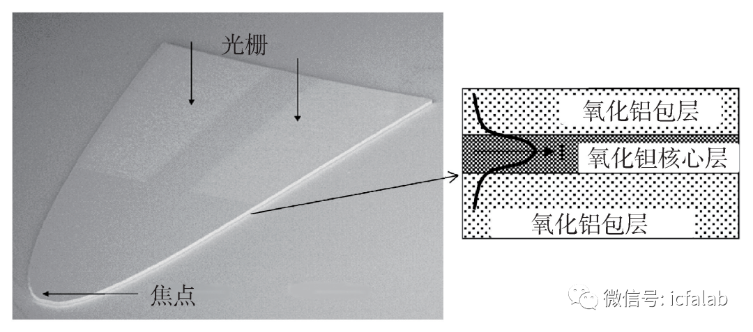a</Sl 4.2.2 光波导如上所述,光盘的没落是因为传统的利用透镜汇聚激光的手段只能将光斑缩小至衍射极限附近(分辨率大约为半个波长)。如蓝光存储采用405 nm的激光,意味着其最小光斑尺寸在百纳米以上,而如果要在硬盘中实现Tb/in2以上的存储面密度,每比特存储单元的特征尺寸要小于25 nm。因此,激光光斑也必须被局限在这样狭小的空间内。为了将激光脉冲的能量精准传导至待写入的存储单元中,希捷提出了结合光波导和近场换能器,对激光能量进行两次汇聚的方案[[4]]。光波导用于将激光光束进行初步缩小,这里通常使用一种平面波导,即固体浸没透镜(planar solid immersion mirror,PSIM)。固体浸没透镜的结构如图11所示,包含氧化钽核心层,上下覆盖氧化铝包层,整体被刻蚀成抛物线的形状。由于氧化钽的折射率高于氧化铝,所以当激光入射至固体浸没透镜侧壁时,会发生全反射,最终汇聚于固体浸没透镜的尖端处。 e2MjV8Bs !v]~ut !p