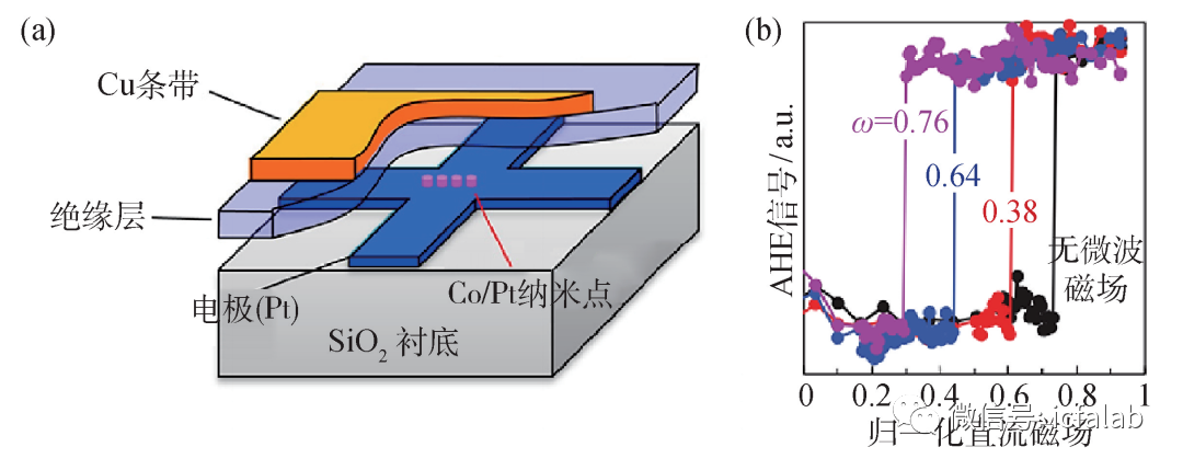 图4 微波辅助磁翻转效应首次在Co颗粒上被发现 (a)Co颗粒附着于约瑟夫森微桥结上,约瑟夫森微桥结两端施加交变电流,进而产生微波磁场;(b)微波磁场的存在有效降低了Co颗粒的临界翻转场[7] #-g2p?+i& m$$sNPnT 随后,类似的现象在其他的软磁材料比如NiFe及FeCo合金薄膜中被发现,证实了微波辅助磁翻转效应的普遍性[8—10]。2009年Nozaki等人利用铁磁共振手段在具有垂直磁各向异性的Co/Pd多层膜中发现水平方向的微波磁场可以促进多畴态的形成,进而辅助磁翻转[11]。如前所述,为了实现较高的存储密度,硬盘存储介质为具有垂直磁各向异性的材料,因此,Nozaki等人的研究结果直接推动了微波辅助磁翻转效应在存储领域的应用进程。 +3-f$/po gyv @_}Y3 图5 微波辅助磁翻转效应可以在具有垂直磁各向异性的纳米结构中实现 (a)器件结构示意图,其中Co/Pt纳米柱具有垂直磁各向异性,Cu条带用来施加微波磁场,霍尔条(电极)用于进行AHE测试;(b)不同电流频率下测得的器件的AHE信号[12] W)u9VbPk[ f5#VU7=1F2 2012年,Okamoto等人在纳米结构中观测到了微波辅助磁翻转现象,图5(a)为测试器件的结构示意图[12]。Ta/Pt/Co/Pt薄膜生长于石英玻璃衬底上,经过一系列微纳加工流程,Co/Pt被刻蚀成纳米尺寸的圆柱,Ta/Pt层则被刻蚀为霍尔十字条,用于反常霍尔效应(anomalous Hall effect,AHE)测试。反常霍尔效应测试是自旋电子学中一种常见的材料表征手段,由于材料的磁性状态和反常霍尔电压有着紧密的关联,因此可以通过提取器件的霍尔电压观测材料磁性的变化。为了施加微波磁场,他们又先后沉积了SiO2绝缘层以及宽度为2 μm的Cu条带,通过交变信号发生器向Cu条带注入一系列电流脉冲,使得Cu条带附近产生极化方向和条带垂直的线极化微波磁场。图5(b)展示了器件在不同频率微波磁场下的反常霍尔信号,可以看到随着微波磁场频率的增加,器件的临界翻转磁场不断地减小,证实微波磁场对于纳米器件的磁翻转同样具有辅助作用。 h{e?Fl sTECNY=l 9:*a9xT, 3.2 基于自旋纳米振荡器的微波辅助磁记录技术利用微波辅助磁翻转效应可以有效降低磁性材料的临界翻转场,这为硬盘的进一步扩容提供了希望,但是在当前高密度存储硬盘中磁头的尺寸非常小,如何在其中加入高频微波源成为一个棘手的问题。 K`kWfPwp 2003年,Kiselev等人首次在纳米尺度的磁自旋阀中观测到高频微波发射的现象[13]。此类器件被称为自旋纳米振荡器,迅速引起了产业界的广泛关注。自旋纳米振荡器的核心为纳米磁性多层膜,主要包括磁性固定层、非磁间隔层以及磁性自由层。当一定大小的电流注入到器件中时,磁性固定层会先将其极化为自旋流,进而对磁性自由层的磁矩施加自旋转移矩。与此同时,自由层磁矩还受到阻尼矩的作用,当自旋转移矩完全抵消阻尼矩时,磁矩的动力学过程则主要由进动矩决定,会发生稳定进动,并通过巨磁阻或隧穿磁阻等磁阻效应引起器件电阻发生周期性变化,最终产生微波电压信号。 D(Q=EdlO 和传统的微波器件相比,自旋纳米振荡器具有体积小、易集成以及宽频可调等显著优势。在无线通讯领域有着显著的潜力。另一方面,在自旋纳米振荡器磁自由层磁矩高频进动的同时,围绕器件周围会产生高频的圆极化微波磁场。受此启发,2007年朱建刚等人首次提出将自旋纳米振荡器和硬盘磁头相结合的构想[14]。实验表明,自旋纳米振荡器产生的微波磁场可以显著降低磁介质的临界翻转场,使得将具有更高Ku的磁性材料作为硬盘存储介质成为可能,可以大幅度提升硬盘存储密度。此外,通过理论仿真,他们还发现这一架构将可以显著减小传统硬盘磁记录过程中产生的边界弯曲现象,如图6所示。这有助于减小磁道宽度,提升硬盘存储的轨道密度。 ? UBE0C 9Ljd