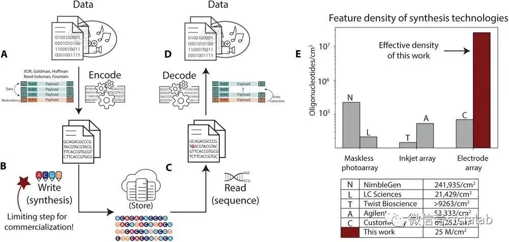 首先,DNA存储数据的写入和读取成本高昂。2017年哥伦比亚大学的实验显示,合成2MB的DNA数据需要7000美元,而读取数据需要2000美元,尽管这相比于2013年每兆12400美元的成本已经大大降低,但如果用户需要以DNA形式储存1GB的电影,编码大约需要花费358万美元,而读取数据还需要102万美元。