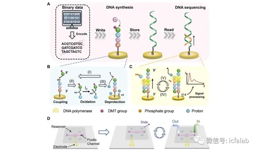 ▲刘宏团队基于电化学DNA合成与测序的DNA数据存储系统流程图(图片来源为东南大学官网)