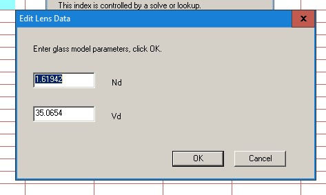 现在我们可以根据需要更改玻璃模型参数。(那些给出玻璃目录上某个位置的Nd和Vd,程序会计算所有定义波长的实际折射率,以便与该区域的真实镜片匹配。)