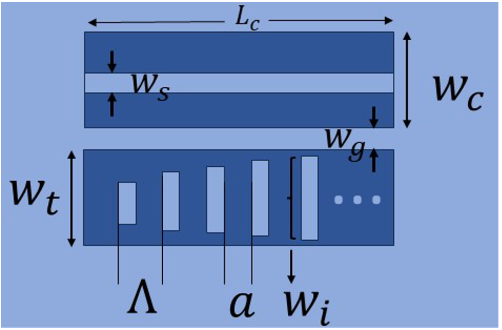 图2.偏振分束器耦合区及相关尺寸示意图(其中 N=29 为耦合区中亚波长光栅单元数量;i=1,2,…,N)