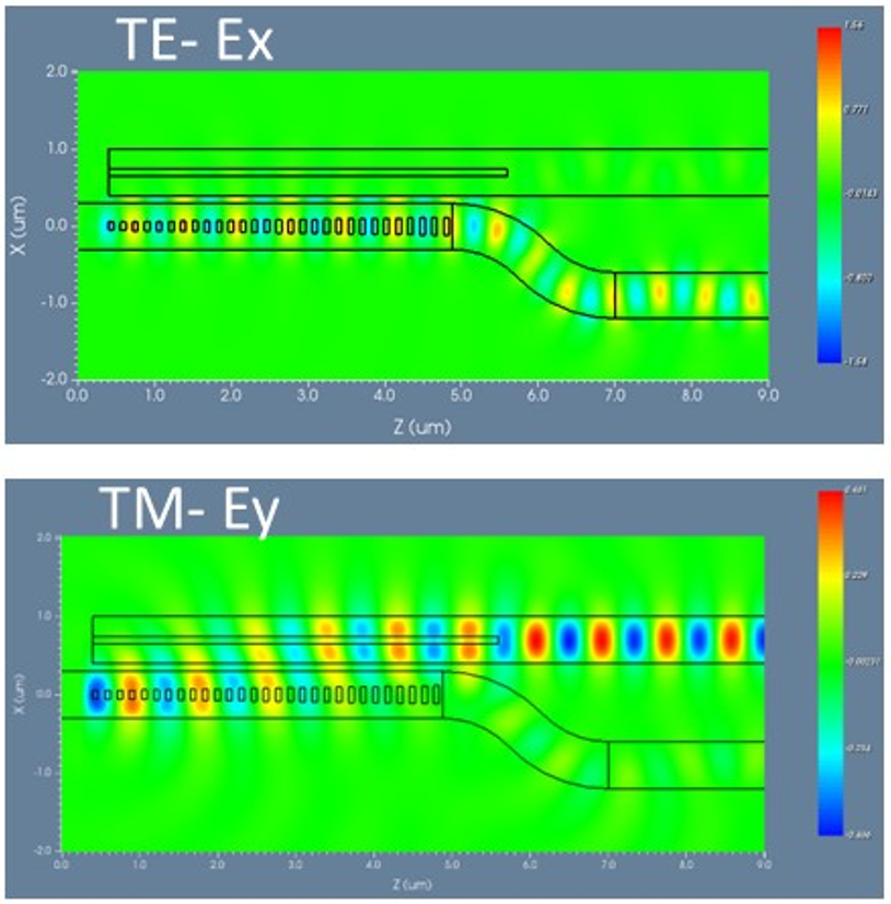 TE 偏振输入波主要沿亚波长光栅波导传输,与槽型波导的耦合极少(见图 4);相反,TM 偏振实现了向槽型波导的最大耦合(见图 4 下图)。这两种状态验证了该设计在分离 TE 和 TM 偏振方面的有效性。 jtqH3xfy