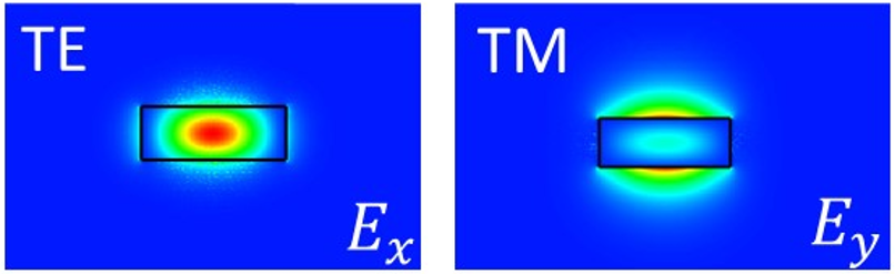 3、结果 !O=?n<Ex" 采用连续波(CW)模态输入场对TE和TM偏振进行三维仿真。TE 偏振(Ex 为主分量)和 TM 偏振(Ey 为主分量)的电场强度如图3所示,其模式的有效折射率分别为2.58 和1.86。 {ctEjgiE 图4.输入波导处 TE 和 TM 偏振的电场强度(主分量分别为 Ex 和 Ey)