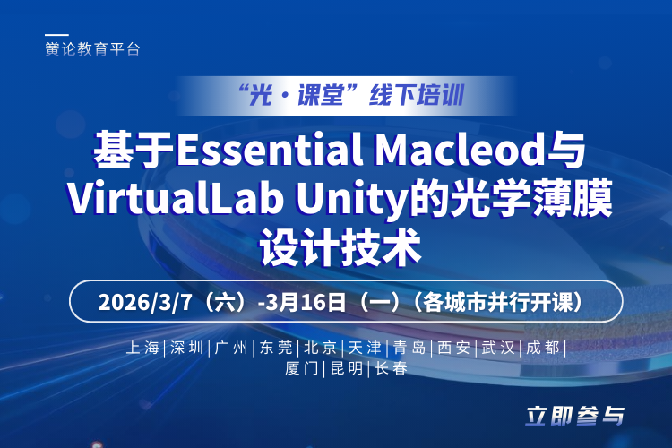 光学系统都离不开光学薄膜。其通过调控光的反射、透射、偏振等特性,成为各类光学器件与系统实现核心功能的关键支撑。专业化仿真工具目前成为了薄膜设计的核心助力。本课程聚焦光学薄膜设计的实用技术,融合光学薄膜基础理论、材料特性分析、典型膜系设计等关键知识。通过理论讲解与实操训练相结合的方式,讲解如滤光片,增透膜,高反膜等常用膜堆的设计方法,并介绍基于